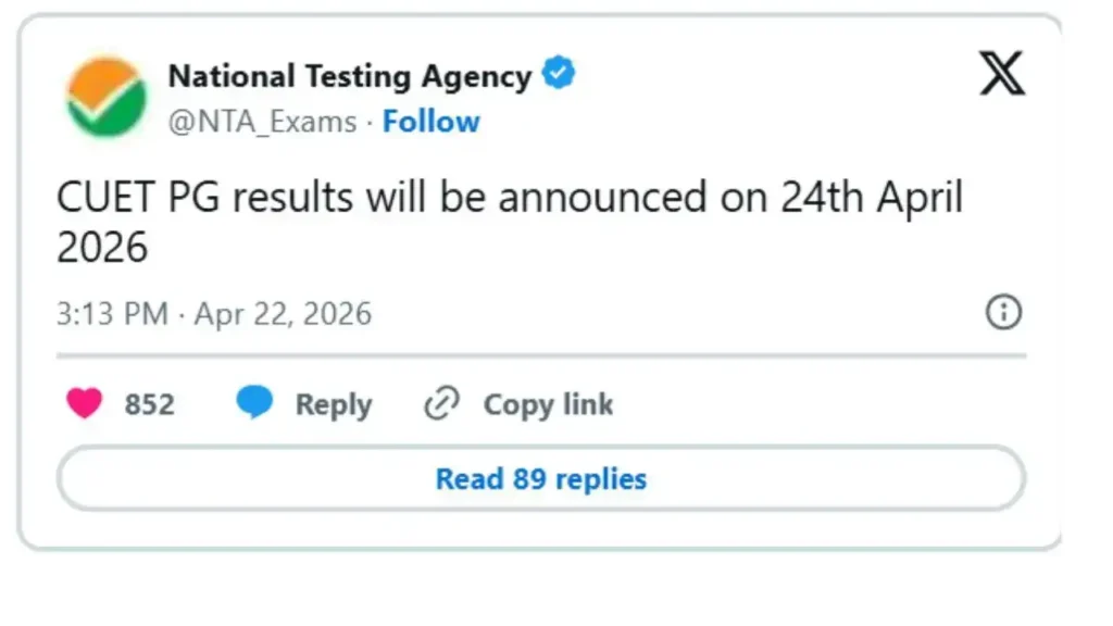 रिजल्ट को लेकर नेशनल टेस्टिंग एजेंसी की ओर से एक दिन पहले ही उनके एक्स हैंडल यानी ट्विटर हैंडल पर उन्होंने एक पोस्ट करके यह जानकारी दी है कि CUET पीजी यानी पोस्ट ग्रेजुएट एग्जाम 2026 का रिजल्ट 24 अप्रैल को शाम 5:00 बजे तक घोषित किया जाएगा इसको लेकर जो भी उम्मीदवार इंतजार कर रहे हैं उन उम्मीदवारों के लिए अच्छी खबर है क्योंकि उनका इंतजार आज समाप्त हो जाएगा और यह रिजल्ट आज जारी किया जाएगा रिजल्ट देखने की पूरी जानकारी नीचे दी गई है ।